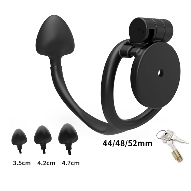With the Black Abstinence Flat Chastity Cage, experience complete control. For a snug fit, this gadget combines a stylish metal cage with cozy ABS rings that measure 44, 48, or 52 mm. For a better experience, the package comes with three optional silicone anal plugs (3.5 cm, 4.2 cm, and 4.7 cm). comes with two keys, a lock, and a free auxiliary belt for covert, all-day use.